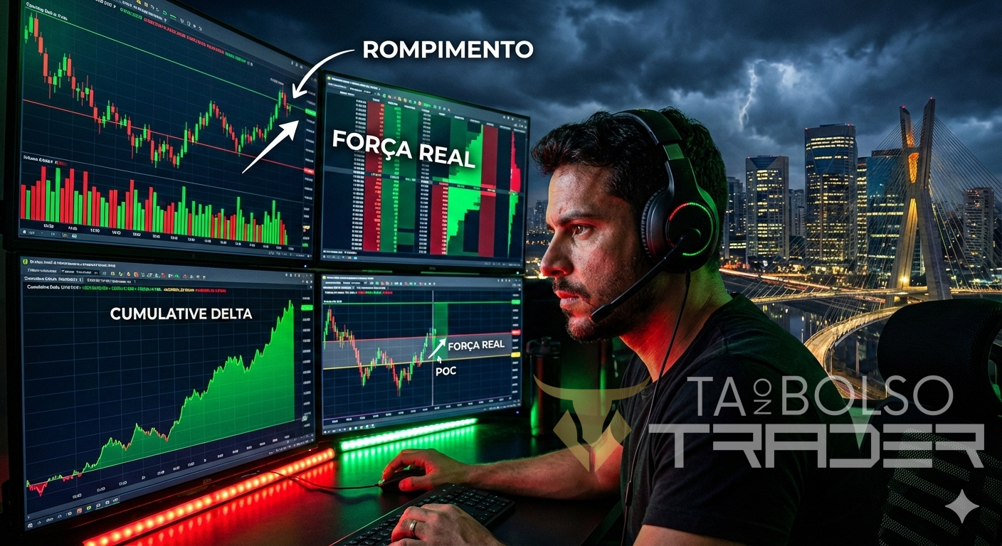 ☐ Volume > 35% do volume médio diário até 9h12? ☐ Delta cumulativo claramente positivo ou negativo? ☐ Book mostra absorção agressiva do lado vencedor? ☐ Pullback tem volume muito baixo? ☐ Preço > 0,8% distante da VWAP na direção do movimento? ☐ Preço saiu da Value Area da abertura com volume crescente?